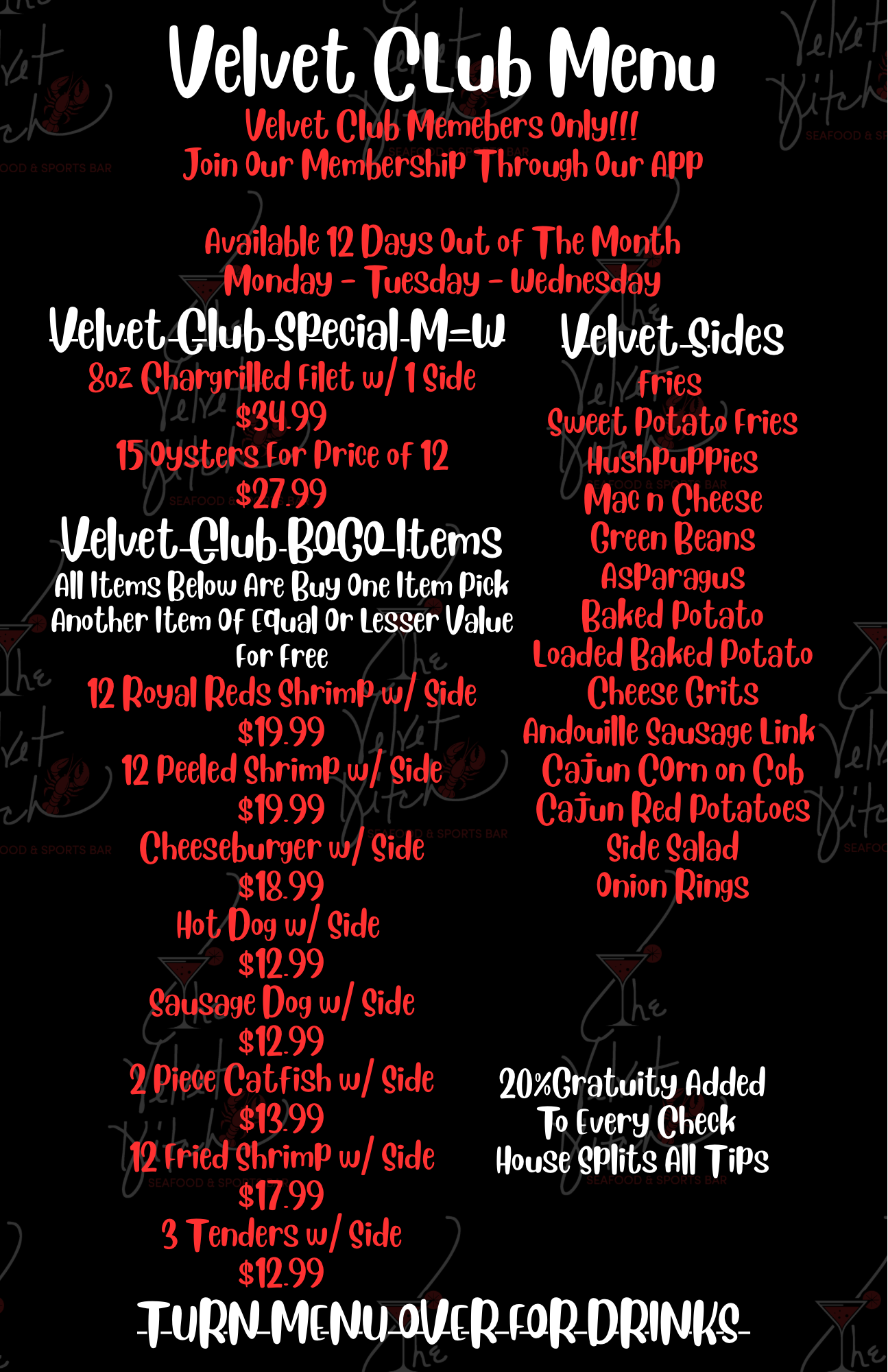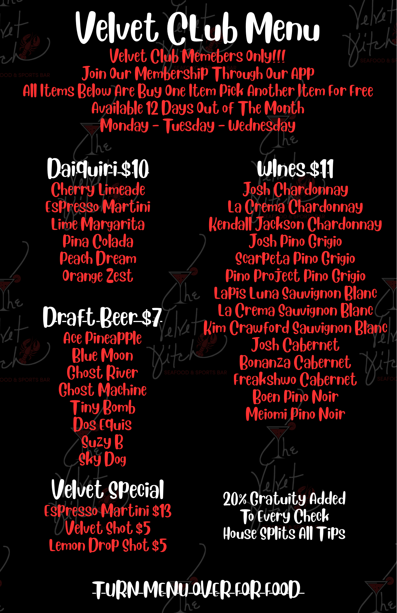 Stay up to date with our event schedule, menu specials, and more. Also, if you become a VELVET CLUB member, you get special benefits such as: